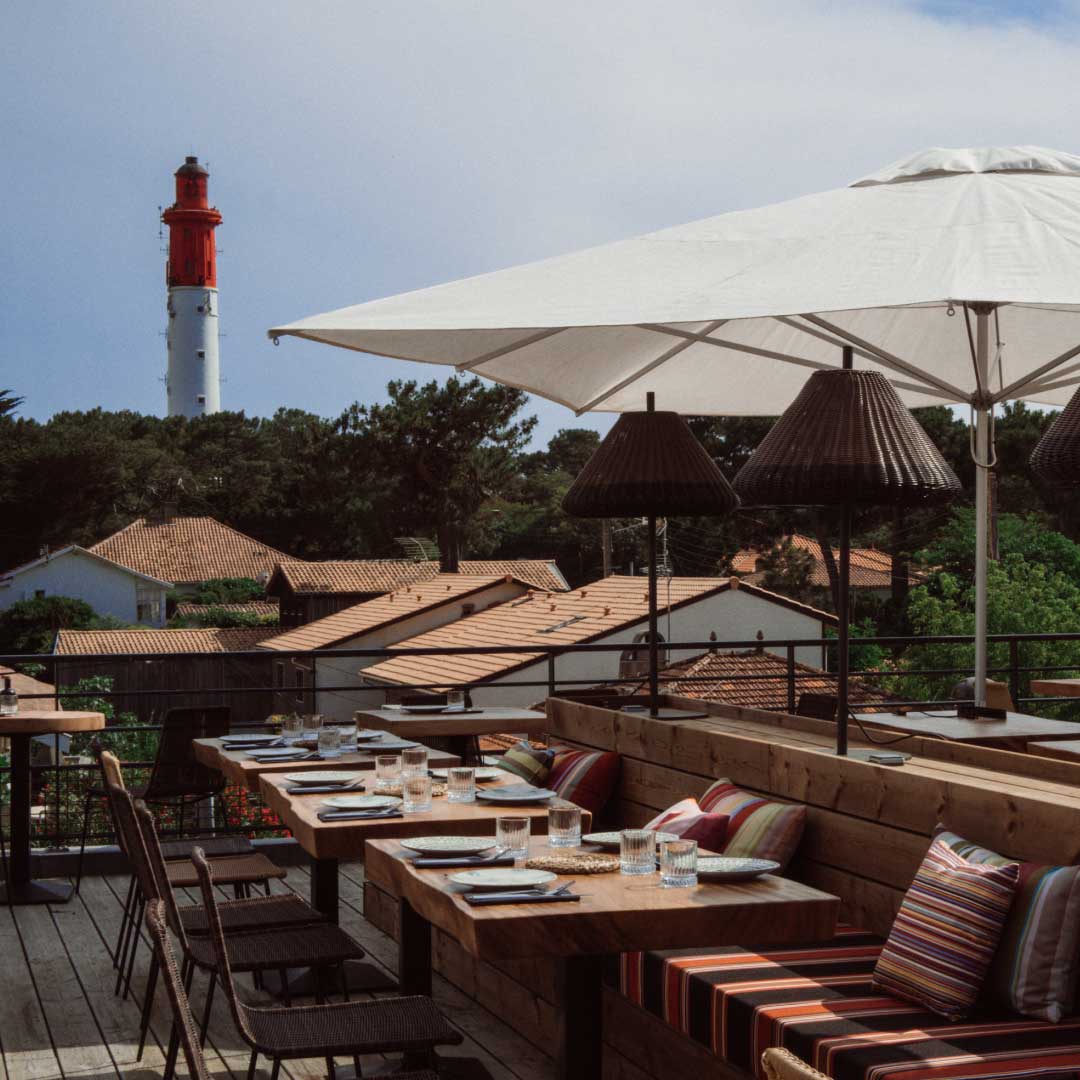 Nouvel établissement °Fahrenheit Seven inauguré en Juin 2022, le Roc Seven Cap Ferret est né de la rénovation d'un restaurant existant, dans le périmètre protégé Bâtiment de France du célèbre phare de la presqu'île. Loin des inspirations urbaines des autres établissements du groupe, le Roc Seven Cap Ferret incarne un certain "esprit du Sud" et avec lui, la tendresse des plaisirs simples. D’un apéritif entre amis, d’une tablée familiale, d’un dîner en amoureux, d’une soirée d’été. La décoration d'intérieur mêle ainsi différentes inspirations latines: une cuisine conviviale, des étagères qui rappellent les Cavos grecques, des tomettes et poteries espagnoles... et bien sûr, de nombreux éléments de mobilier sortis de l'esprit de Véronique Vidoni et réalisés sur-mesure par MKF-DD.